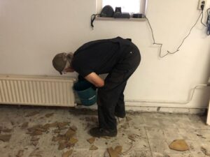 De radiatoren in de grote zaal verdwijnen en daarom moesten de cv-leidingen worden verlegd en aangesloten op de bestaande leidingen. Deze leidingen verdwijnen onder het schuimbeton.